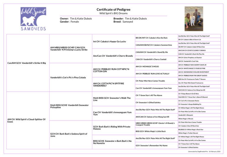 Grace was our keeper puppy from the January 2023 Mr. Big x Marcy litter. While she never particularly enjoyed the pageantry of the show ring, she made her quality clear early on, winning a large Open Class at the 2024 Samoyed Club of America National Specialty during one of her limited appearances.