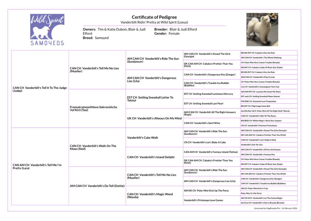 Lexus was brought in to our breeding program in December, 2025 from Vanderbilt Samoyeds. She was bred by and is co-owned with J & B Elford. Born from a frozen breeding between a stunning female named Lara (AM/CAN CH Vanderbilt’s Tell Me I’m Pretty) and an outstanding producer named Judge (CAN CH Vanderbilt’s Tell It To The Judge). Her pedigree is strongly influenced by the father of the sire and grandfather of the dam, a dog named Mueller (Vanderbilt’s Tell Me No Lies). Mueller is one of the most productive and influential Samoyed studs of the modern era, and responsible for some of the best showing and producing Samoyeds around today. We expect big things from Lexus in the future.